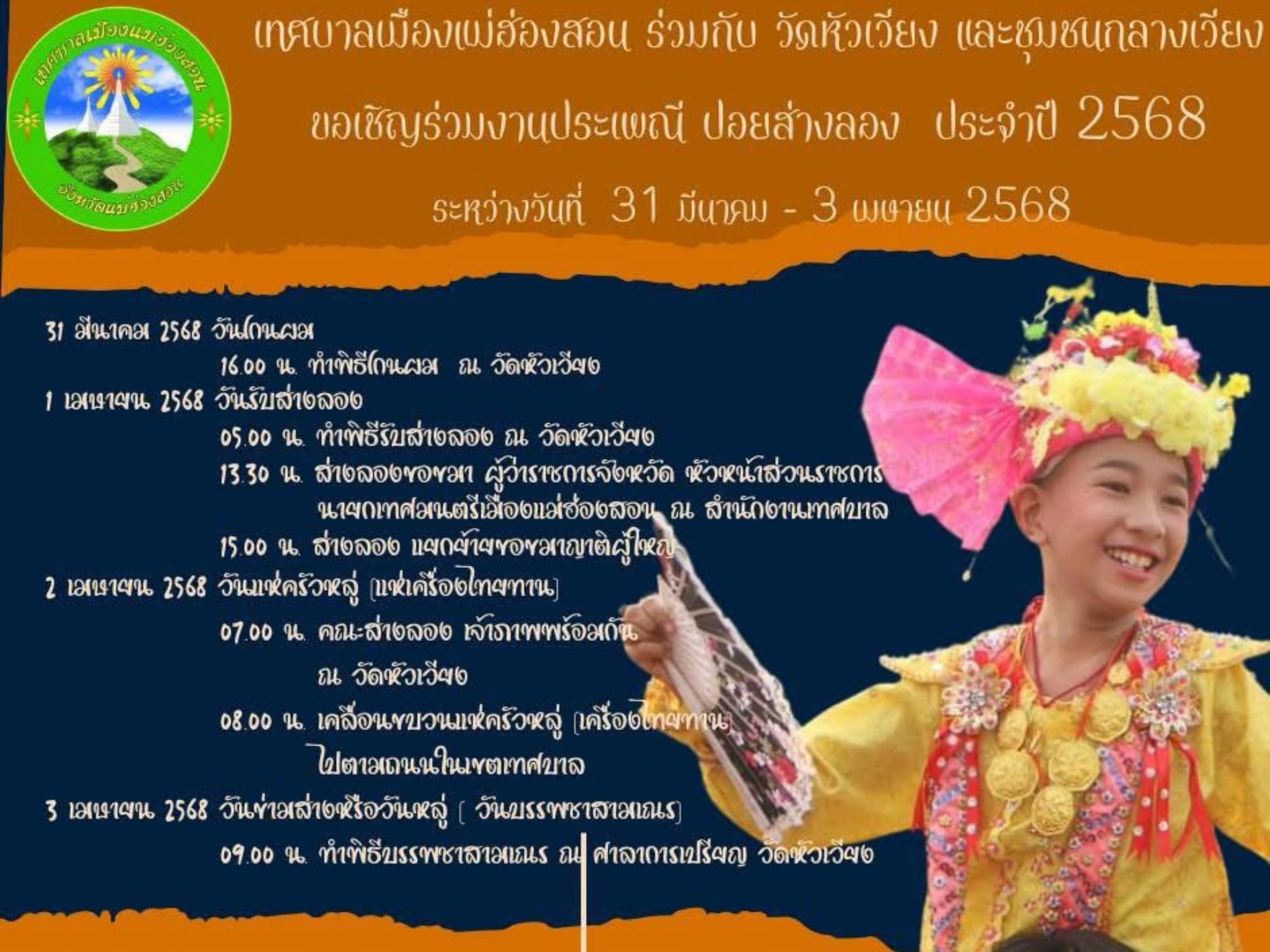เทศบาลเมืองแม่ฮ่องสอน ร่วมกับวัดหัวเวียง และศรัทธาชุมชนกลางเวียง จัดงานประเพณีปอยส่างลอง ประจำปี 2568 ขึ้นในระหว่างวันที่ 1 – 3 เมษายน 2568 ณ วัดหัวเวียง