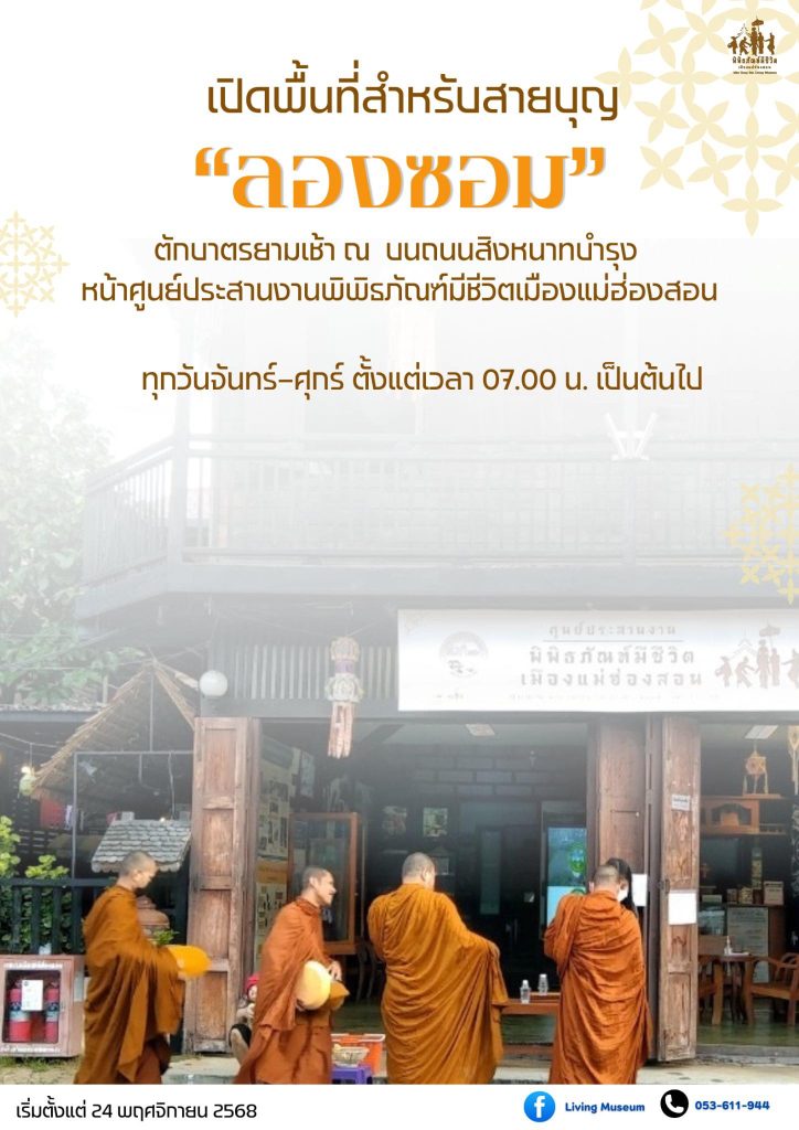 ศูนย์ประสานงานพิพิธภัณฑ์มีชีวิต เปิดพื้นที่ให้ผู้มาเยือนได้ร่วม “ลองซอม” ตักบาตรยามเช้า ทุกวันจันทร์–ศุกร์ ตั้งแต่เวลา 07.00 น. เป็นต้นไป