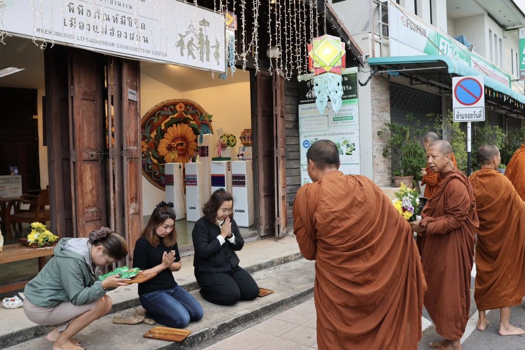 “ลองซอม” ตักบาตรยามเช้า บนถนนสิงหนาทบำรุง หน้าศูนย์ประสานงานพิพิธภัณฑ์มีชีวิตเมืองแม่ฮ่องสอน