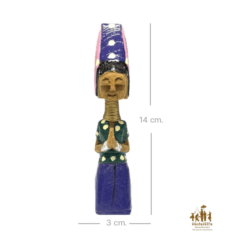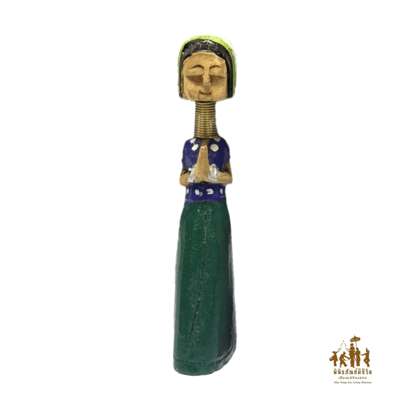 Produced with care by a group of local women from Ban Huai Pu Kaeng Village, in Pha Bong Subdistrict, Mueang District, Mae Hong Son, these dolls are made using natural materials such as fine softwood, handwoven cotton, and carefully coiled brass wire to represent the signature neck rings of Karen women. Each stage—wood selection, intricate carving, and the meticulous dressing of the dolls in traditional tribal attire—is done entirely by hand. This process ensures that each piece is not only a product of craftsmanship but also a heartfelt expression of cultural identity by skilled artisans who deeply understand their own heritage.