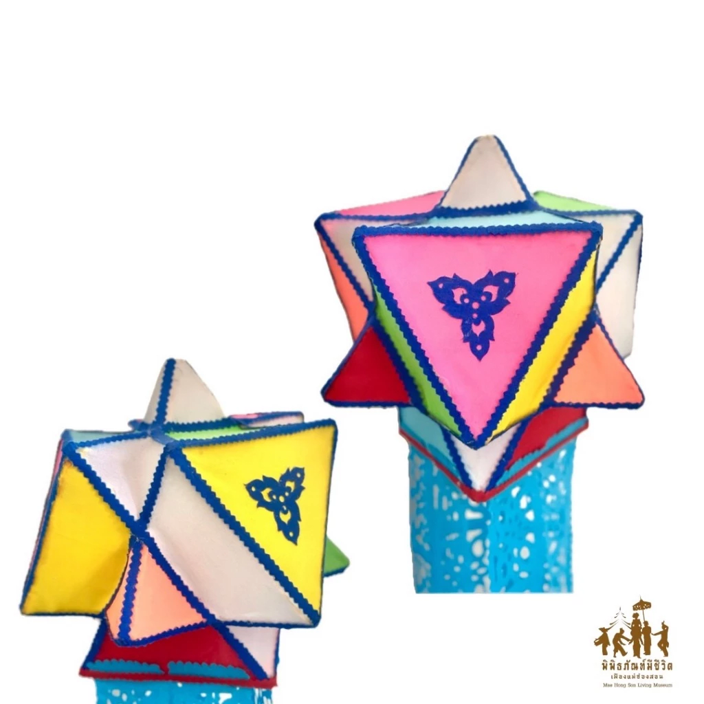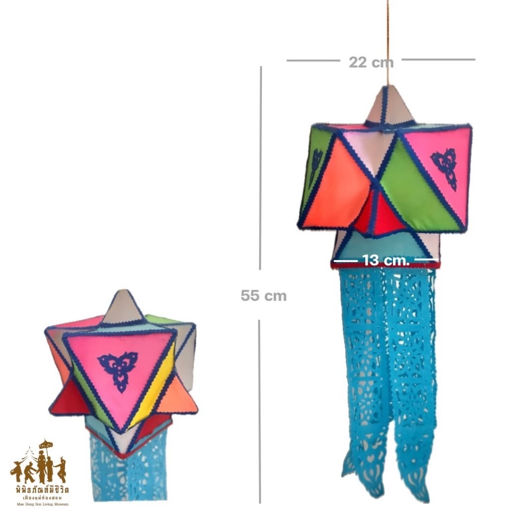 The Tai Yai triangular lantern is a traditional handicraft that embodies the wisdom and cultural heritage of the Tai Yai ethnic group, primarily based in Northern Thailand, especially in Mae Hong Son Province. In this region, art, traditions, and spiritual beliefs remain beautifully preserved and closely integrated into daily life. More than a decorative item or light source, the lantern serves as a “light of the spirit,” expressing generations of faith, hope, and cultural and religious values. Its distinctive triangular geometric form symbolizes harmony between nature and the human spirit, reflecting a graceful fusion of belief and artistic expression. These lanterns play a central role in various Tai Yai ceremonies and festivals, including the Tai Yai New Year (around April), Loy Krathong, annual merit-making events, and other religious activities. At night, they are illuminated to offer a guiding light symbolizing happiness and auspiciousness, believed to release suffering and welcome good fortune with a pure heart. Each lantern’s color and pattern carry deep meaning: red represents vitality and courage, yellow signifies wisdom and prosperity, green stands for abundance, and purple conveys faith and spirituality. Common motifs include lotus flowers, Nagas (mythical serpents), geometric designs, the sun, and native floral patterns—each linked to religion, nature, and auspicious symbols.
